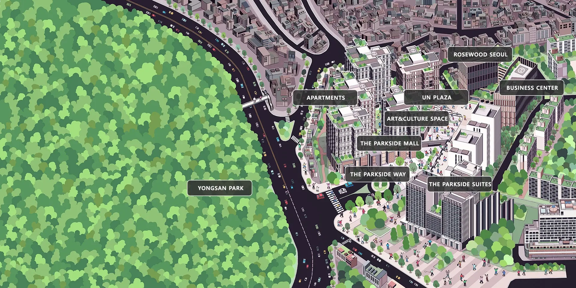 이곳에서 열리게 될 공연, 전시, 패션쇼 등의 다양한 문화적 이벤트들과 LORENZO QUINN, 박은선 등 세계적인 아티스트들의 작품으로 꾸며질 더파크사이드 웨이는 오가는 이들에게 수준 높은 예술적 체험을 전할 것입니다.